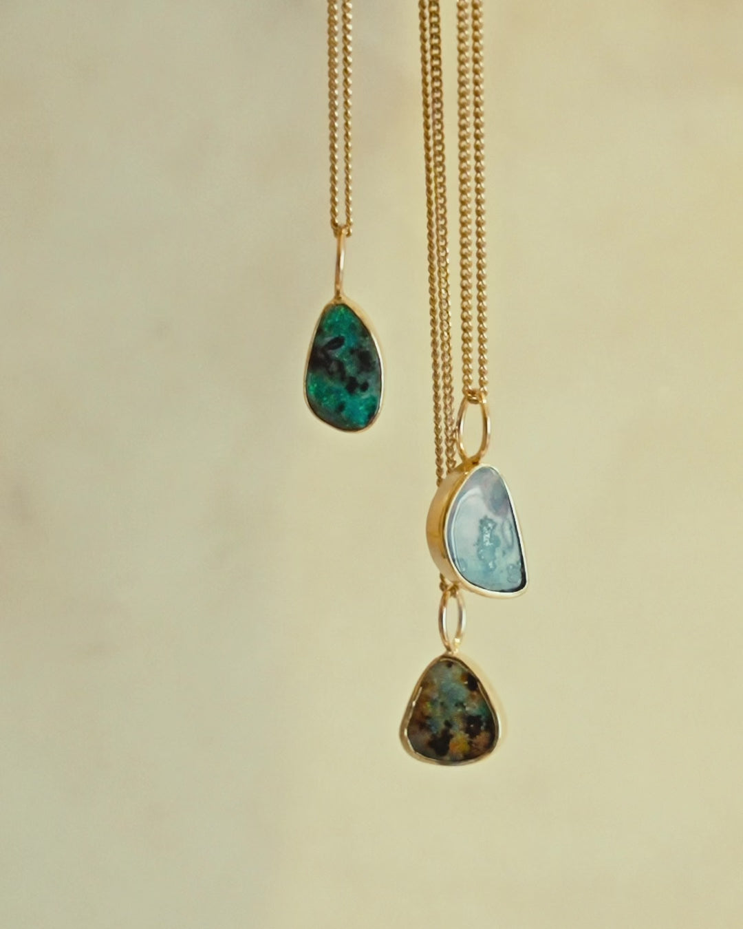 Cada ópalo viene de una pequeña mina familiar en Australia, extraído a mano, con respeto por la tierra y por el tiempo que toma hacer las cosas bien. Se pulen uno a uno en circuito cerrado de agua, para conservar la energía intacta y proteger el entorno.